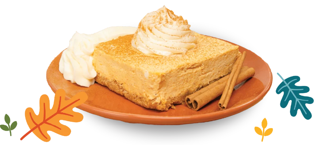 This cheesecake blends real pumpkin, nutmeg, and spices with our creamy signature recipe. We then top it with housemade whipped cream and a sprinkle of cinnamon to create the perfect fall treat!