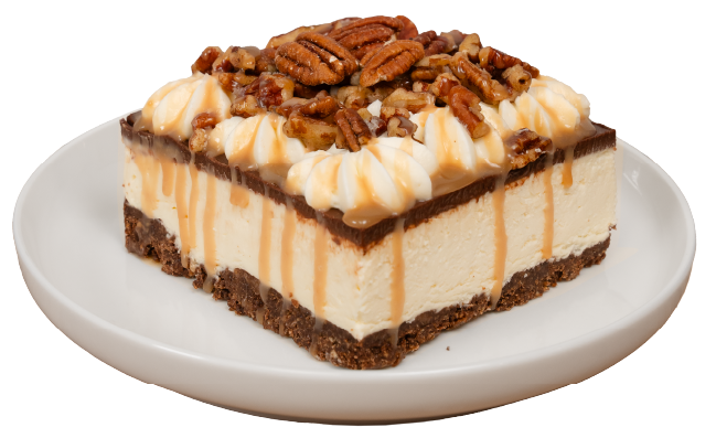 Our signature creamy cheesecake features a rich chocolate crust, layered with our house-made chocolate ganache and salted caramel cream. Finished with a generous drizzle of salted caramel and toasted pecans.